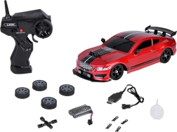- voiture RC, télécommande 2,4 GHz, batterie 7,4 V 500 mAh, chargeur USB, pneus de rechange, clé pour roues, pipette pour l’eau, attaches de carrosserie
