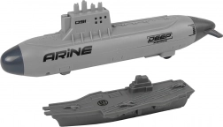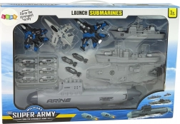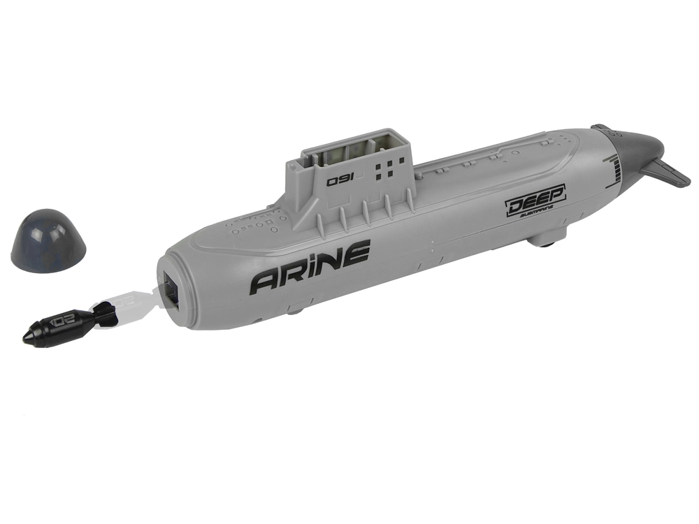 La pièce maîtresse est un sous-marin avec lanceur mécanique et roulettes pour un mouvement fluide sur le sol. Insérez le projectile par le haut, tirez l’arrière et tirez – les “bombes” en plastique sûres ajoutent une touche d’action au jeu. La flotte comprend un navire de guerre, un navire de ravitaillement et un porte-avions, tandis que trois chasseurs assurent l’appui aérien pour chaque mission.