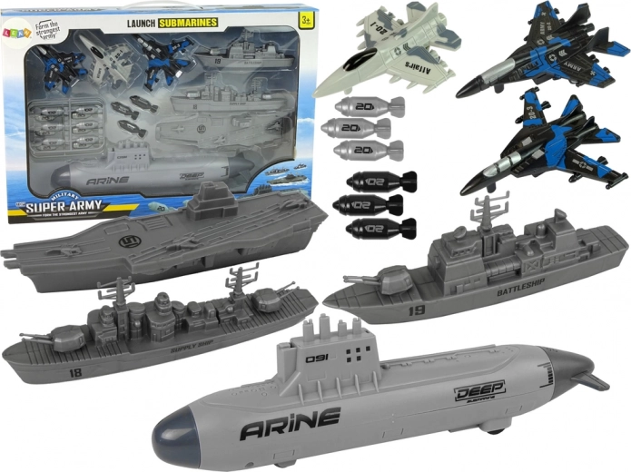 sous-marin avec lanceur, 3 avions de chasse, navire de guerre, navire de ravitaillement, porte-avions, 9 bombes en plastique