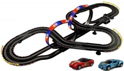 Profitez de longues heures de courses palpitantes ! Ce circuit électrique combine conduite fluide, loopings spectaculaires et effets lumineux dynamiques. Deux petites voitures à l’échelle 1:43 (rouge et bleue) permettent une course équitable à deux joueurs simultanément, tandis que la console de contrôle avec interrupteurs clairs assure une utilisation confortable.