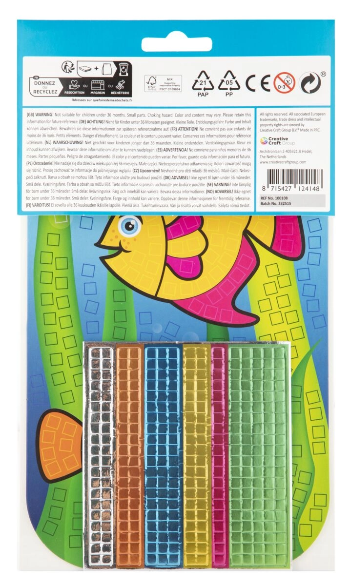 Un kit amusant et créatif pour enfants qui permet de réaliser une superbe mosaïque métallique sur le thème des poissons. Il suffit d’utiliser des carrés autocollants en mousse colorée et de les appliquer sur le modèle en suivant les couleurs indiquées pour obtenir une image captivante.
