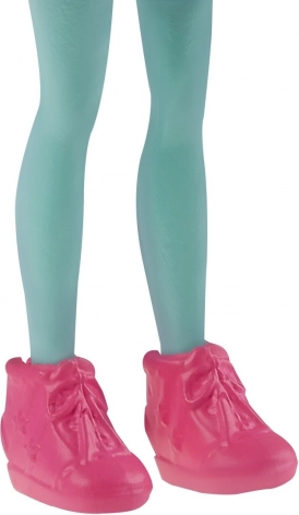 Le sweat violet, les leggings turquoise et les bottines roses attirent le regard et stimulent l’imagination pendant le jeu.