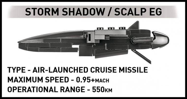 - Armement amovible et configurable : deux missiles Storm Shadow (SCALP‑EG), roquettes AIM‑9 Sidewinder et AIM‑120 AMRAAM