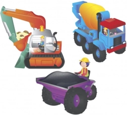 - 8 pièces spéciales en forme de véhicules (p. ex. bulldozer, bétonnière, grue) – utilisables comme pochoirs pour le dessin.