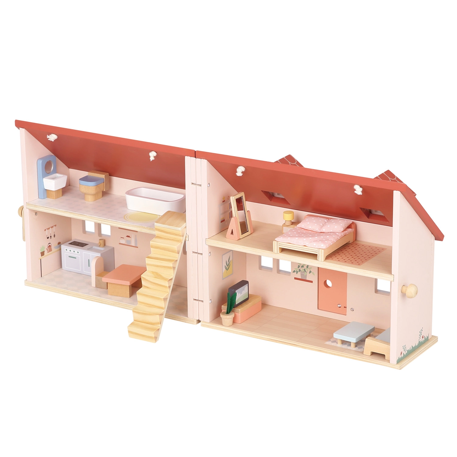Découvrez la magie du jeu avec cette maison de poupées en bois pliable qui, une fois ouverte, révèle un intérieur à deux étages avec des pièces entièrement équipées. Grâce à sa poignée de transport, à ses 18 pièces de mobilier et à ses 2 figurines en bois, elle est idéale pour un jeu créatif à la maison comme en voyage. Fabriquée en bois certifié FSC pour un plaisir sûr et durable.