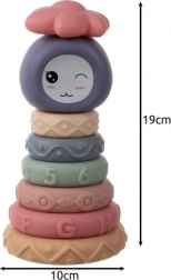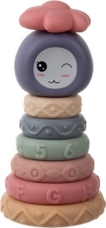 Assemblez une tour colorée avec une adorable tête de chaton et un chapeau en forme de fleur. Six anneaux pastel aux surfaces variées invitent à explorer, presser et enfiler. Certaines pièces couinent lorsqu’on les presse, ce qui stimule l’ouïe et enseigne la relation cause–effet.