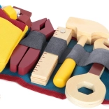 La ceinture à outils Workshop transforme chaque jeu en aventure riche en apprentissages. Grâce à sa construction solide et à la combinaison de bois, textile et métal de qualité, elle résiste à un usage quotidien. Les enfants ont toujours à portée de main un marteau, un tournevis, une clé, une pince et un mètre pliant – le tout rangé en sécurité dans les passants et poches de la ceinture.