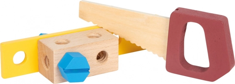 Marteau, clé, tournevis, pince et scie en bois de qualité favorisent le jeu de rôle et apprennent aux enfants des compétences de base de façon ludique.