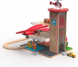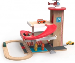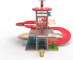 Ce garage en bois de haute qualité avec circuit de train offre trois niveaux de stationnement, un ascenseur fonctionnel à manivelle et un héliport sur le toit. Les enfants peuvent faire le plein au rez-de-chaussée, monter la voiture avec l’ascenseur, puis la lancer sur la rampe spiralée rouge jusqu’en bas, où elle enchaîne en douceur sur les rails. Des matériaux durables et des détails bien pensés garantissent une longue durée de vie et un jeu en toute sécurité.
