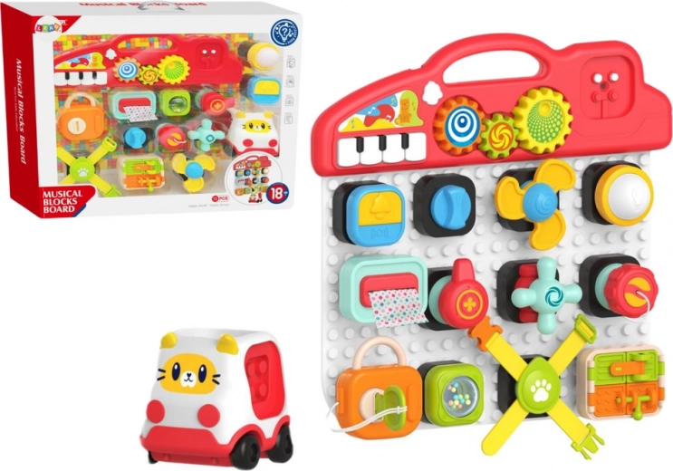 - Panneau interactif : Panneau universel auquel on peut connecter divers éléments éducatifs et sensorimoteurs, permettant des assemblages créatifs.
