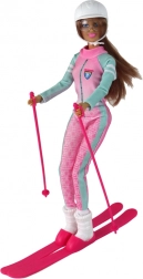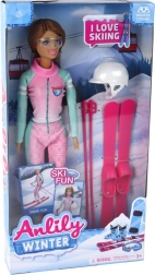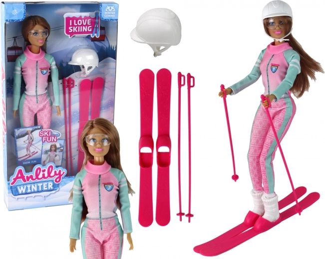Poupée Anlily est une poupée magnifiquement décorée qui rappelle une véritable skieuse. Elle a de longs cheveux bruns et porte un casque blanc pour skier en toute sécurité, complété par des lunettes colorées stylées. Elle est habillée d'une combinaison de ski rose avec des détails verts contrastants et des bottes de ski blanches qui s'harmonisent parfaitement avec son ensemble.