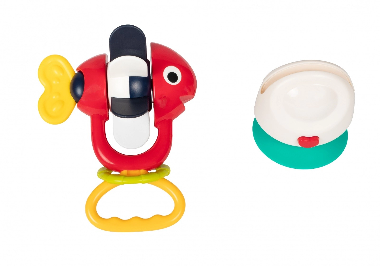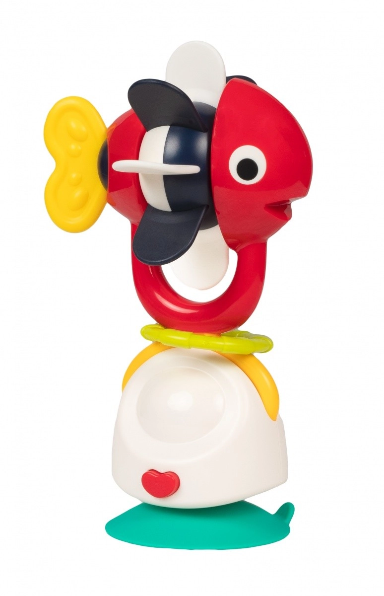 Hochet 2-en-1 coloré en forme de petit poisson avec une ventouse solide qui attire bébé par ses couleurs contrastées, son bruit de grelot agréable et sa partie supérieure rotative. Il adhère fermement aux surfaces lisses, stimule la vue, l’ouïe et la motricité fine et est fabriqué en matériaux sûrs sans BPA pour les enfants dès 6 mois.