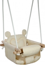 La balançoire est conçue avec des éléments décoratifs rappelant les oreilles d'un ours, ajoutant à la fois du jeu et du confort.