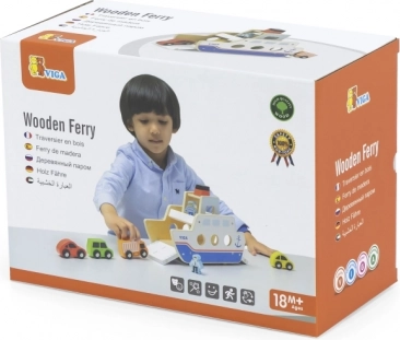 Ferry en bois avec petites voitures et figurines. Bateau roulant avec rampes bilatérales, conception sûre, favorise la motricité. Convient dès 18 mois.