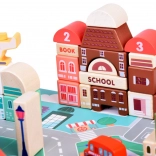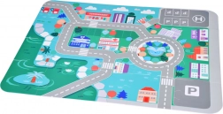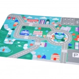 Le tapis représente un paysage urbain avec des routes et des zones de stationnement tracées, incitant les enfants à jouer de manière éducative avec les véhicules.