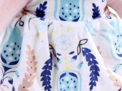 Cette poupée est entièrement réalisée en matière douce et agréable au toucher. Elle porte une robe plissée à motif fleuri, assortie en couleurs avec les chaussures, le col et le chapeau. Ses cheveux sont blonds et bouclés. Les yeux, les sourcils, le sourire et le nez sont brodés, ce qui évite la présence de petites pièces pouvant se détacher pendant le jeu.