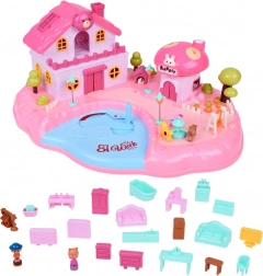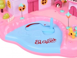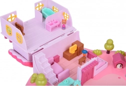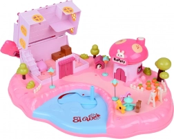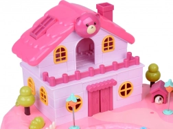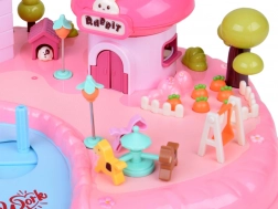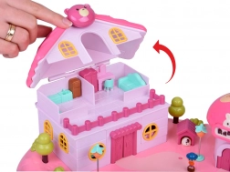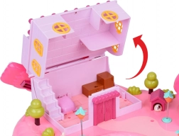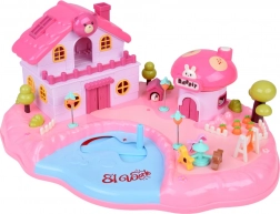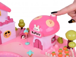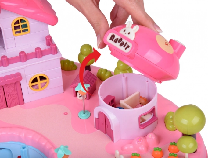 La maison offre un intérieur sur plusieurs niveaux avec des scènes pour le jeu quotidien : chambre douillette avec lit, armoire ouvrante, salle de bain avec baignoire et lavabo, petite cuisine avec réfrigérateur et coiffeuse. Les effets lumineux et sonores déclenchés par des boutons renforcent l’ambiance de jeu et l’enseigne rétroéclairée RABBIT réagit au rythme de la mélodie.