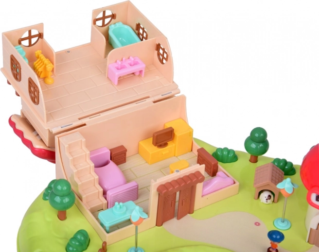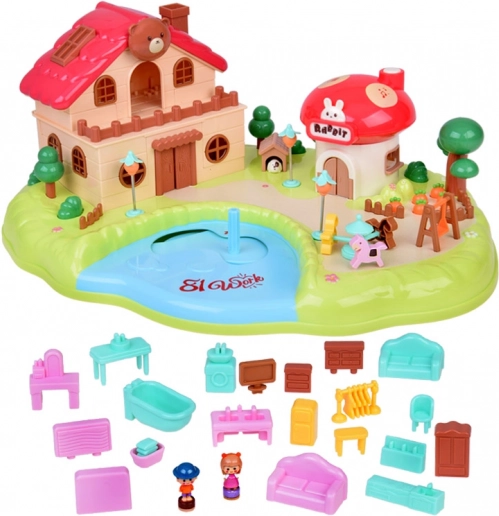 - maison à plusieurs niveaux, boutique en forme de champignon, jardin avec étang, figurines, mobilier et accessoires, éléments d’aire de jeux (manège, balançoire)