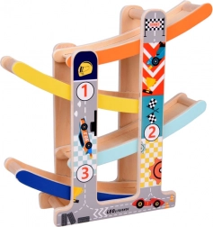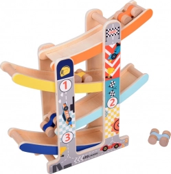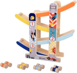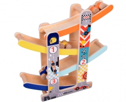 Cette robuste piste à toboggan pour petites voitures en bois offre à la fois amusement et apprentissage. Grâce à ses quatre pistes colorées et ses quatre petites voitures en bois, les enfants profitent de descentes dynamiques tout en entraînant la motricité fine, la coordination œil-main et le principe cause–effet. Le jouet est prêt à l’emploi dès le déballage – sans montage.