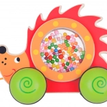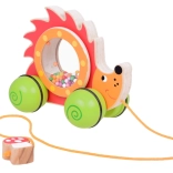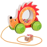 Adorable hérisson en bois sur roulettes avec tambour transparent rempli de billes, parfait compagnon pour les premiers pas. En le tirant, les billes tournent et teintent joyeusement dans son ventre, ce qui motive les enfants à bouger. Le jouet dispose d'une construction stable, de peintures non toxiques et d'une cordelette pratique avec amanite tue-mouches pour un tirage facile.