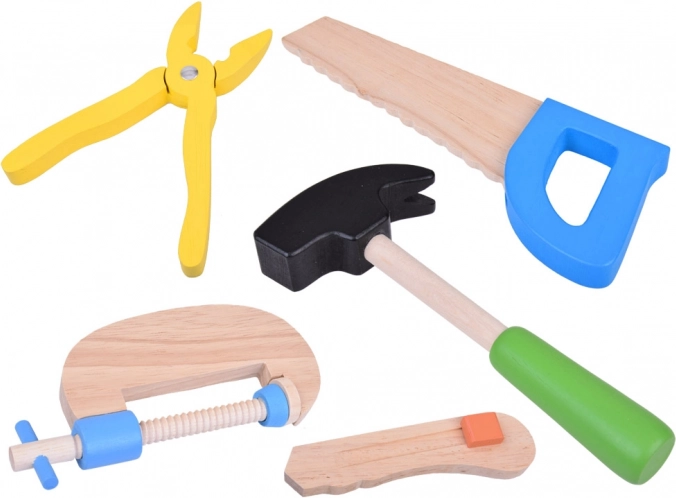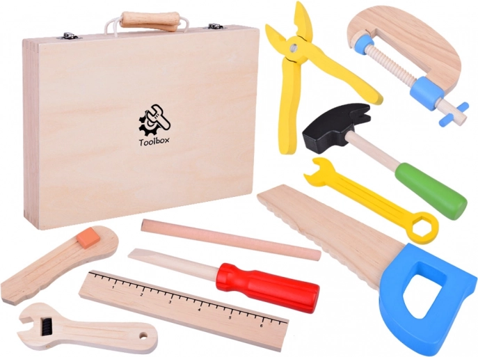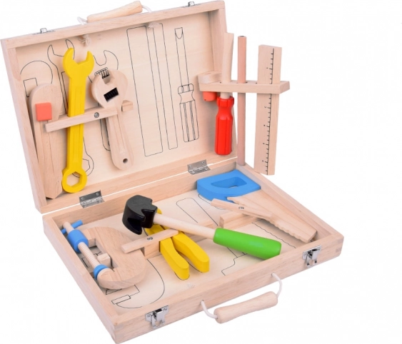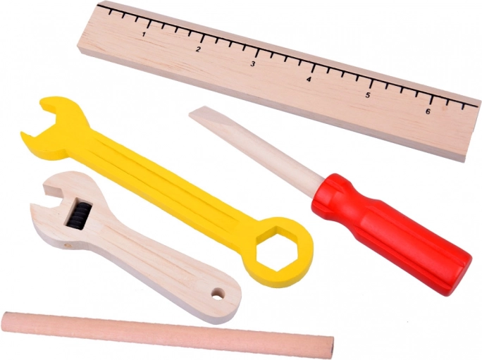 - tournevis (16,5 cm), clé à molette (13 × 4,5 × 1 cm), règle (7 × 2,7 × 1 cm), clé plate (18 × 3,5 × 1 cm), pince (16 × 3 × 1,5 cm), ciseau à bois (14,5 × 4 × 1,2 cm), scie à main (18 × 6,5 × 1,5 cm), marteau (18,5 × 7,5 × 2 cm), crayon (17,5 cm), serre-joint (14 × 6 × 1,2 cm), valisette en bois (29 × 21 × 5,7 cm)