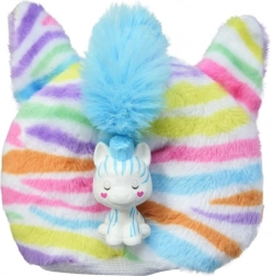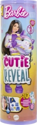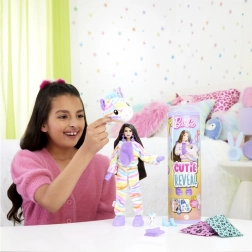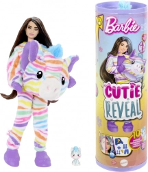 Découvrez un monde de surprises avec la poupée BARBIE Cutie Reveal en costume de zèbre arc-en-ciel. Une fois la douce combinaison peluche retirée, une poupée stylée apparaît avec des accessoires ludiques, une veste de mode bicolore et un effet de changement de couleur à l’eau. Un adorable mini animal et une brosse-éponge pour des révélations de couleurs magiques sont inclus.