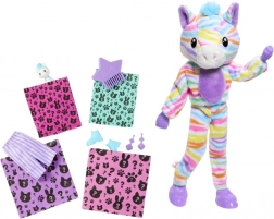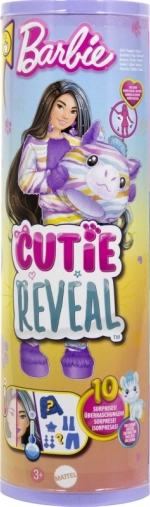 La poupée BARBIE Cutie Reveal de la série « Doux rêves » combine une douce combinaison peluche et le jeu de mode. La tenue colorée de zèbre se transforme en looks stylés – y compris une veste réversible à imprimé floral et effet peau de zèbre arc-en-ciel. La boîte contient également des chaussures, un short et des bijoux pour des mix & match sans fin.