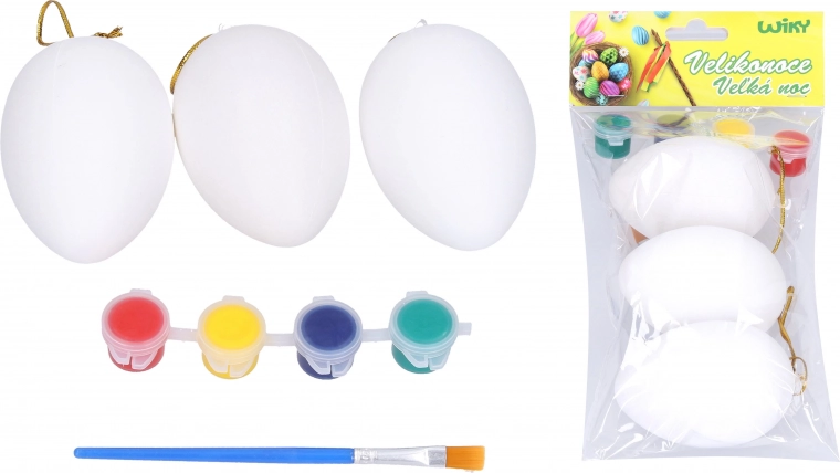 - Kit complet : 3 œufs en plastique, peintures et pinceau