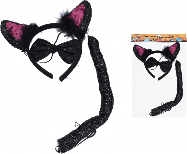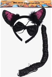 Le set de carnaval « chat noir » est un choix idéal pour les enfants qui veulent transformer leurs rêves en réalité et devenir un élégant personnage félin. Le set comprend un serre-tête avec des oreilles de chat, un nœud papillon et une queue, permettant un déguisement complet.