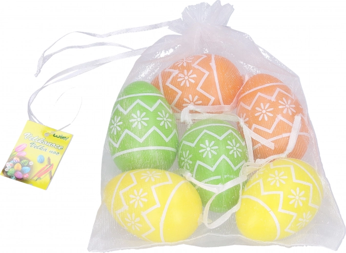 L'emballage comprend six œufs, placés dans un élégant sac en organza, ce qui facilite non seulement leur rangement et leur transport, mais garantit également une présentation stylée. Les œufs sont fabriqués en plastique durable, ce qui assure une longue durée de vie et permet une utilisation répétée. Ils sont légers et faciles à manipuler, ce qui est apprécié même par les enfants à partir de trois ans.