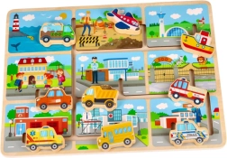 Ce puzzle en bois coloré fait découvrir aux enfants divers moyens de transport. Vous y trouverez un bus scolaire, une voiture de police, une ambulance et d’autres véhicules qui s’insèrent facilement dans les espaces correspondants.