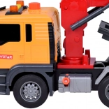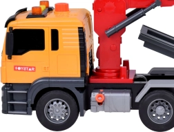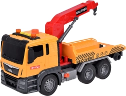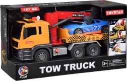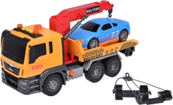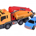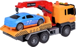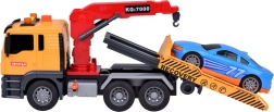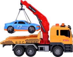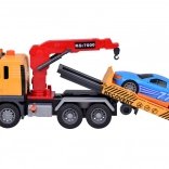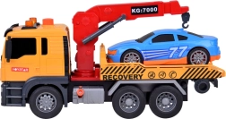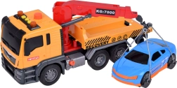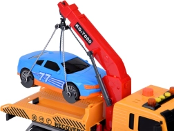 L'ensemble comprend également une voiture bleue de sport, qui s'adapte parfaitement à la dépanneuse. Le jouet entier est réalisé avec des couleurs réalistes - jaune, gris, rouge et bleu.