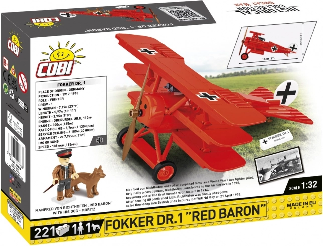 Revivez l’histoire de l’aviation avec le modèle authentique Fokker DR.1 Red Baron à l’échelle 1:32 de COBI. Le set comprend 221 pièces de qualité, des impressions détaillées au lieu d’autocollants, des éléments mobiles (hélice, roues, ailerons) et en plus une minifigurine de Manfred von Richthofen ainsi que son chien Moritz. Idéal pour les collectionneurs, les passionnés d’histoire et le jeu créatif.