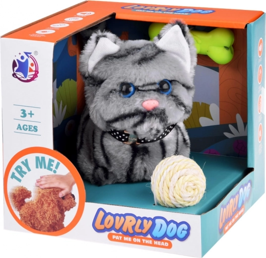 Adorable chaton interactif gris qui fera fondre le cœur de chaque enfant. Après insertion des piles, il commence à avancer et reculer, miauler, bouger la tête, la bouche et la queue. Des accessoires de jeu sont inclus – un os en caoutchouc souple et une balle colorée en corde. Sa peluche agréablement douce est idéale pour les câlins et le jeu quotidien.