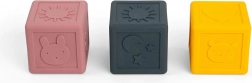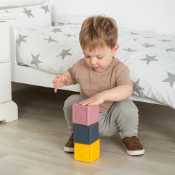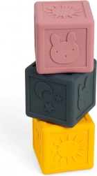 Découvrez la magie des cubes sensoriels en silicone, idéaux pour divertir votre enfant et développer ses sens. Chacun des trois cubes du set présente un motif en relief unique, tels qu’un lapin, le soleil et des étoiles, qui encouragent la perception sensorielle et le sens du toucher. Ces cubes favorisent la dextérité et la coordination œil-main, tout en constituant une jolie décoration pour la chambre d’enfant.