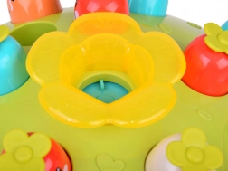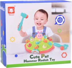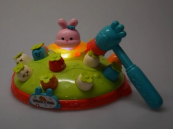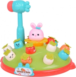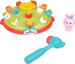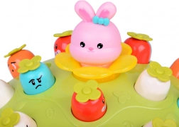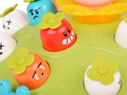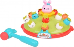 Le jeu Frappez au marteau permet aux enfants de développer leurs compétences motrices dans un environnement ludique. Sur une plateforme colorée rappelant une prairie, des petites carottes de différentes couleurs et expressions sont disposées avec un lapin rose, qui a pour rôle de sauter lorsqu’il est touché par le marteau. Le jeu est accompagné d’une mélodie joyeuse qui capte l’attention des enfants. La plateforme comprend deux niveaux de carottes et un mécanisme ingénieux qui, en tournant le lapin, fait surgir une autre carotte du niveau supérieur.