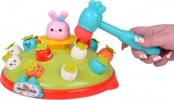 Le set comprend la plateforme avec les petites carottes, le lapin rose et le marteau. Le jeu est fabriqué en plastique et en caoutchouc durables et fonctionne avec 3 piles AA, non incluses.