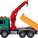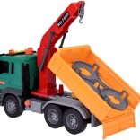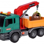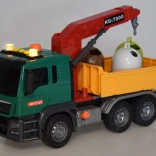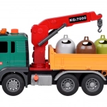 Le camion est équipé d'une grue avec un bras pivotant pour soulever et déplacer les poubelles. La benne du véhicule peut être levée et abaissée pour vider facilement la charge.