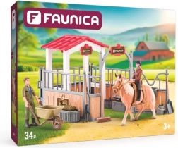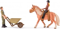 Dans le coffret, vous trouverez tout pour s'occuper du cheval : enclos/abri, cheval avec cavalier, fermier avec brouette et petits accessoires. Les dimensions du cheval 12 × 10 cm sont idéales pour les petites mains.