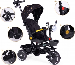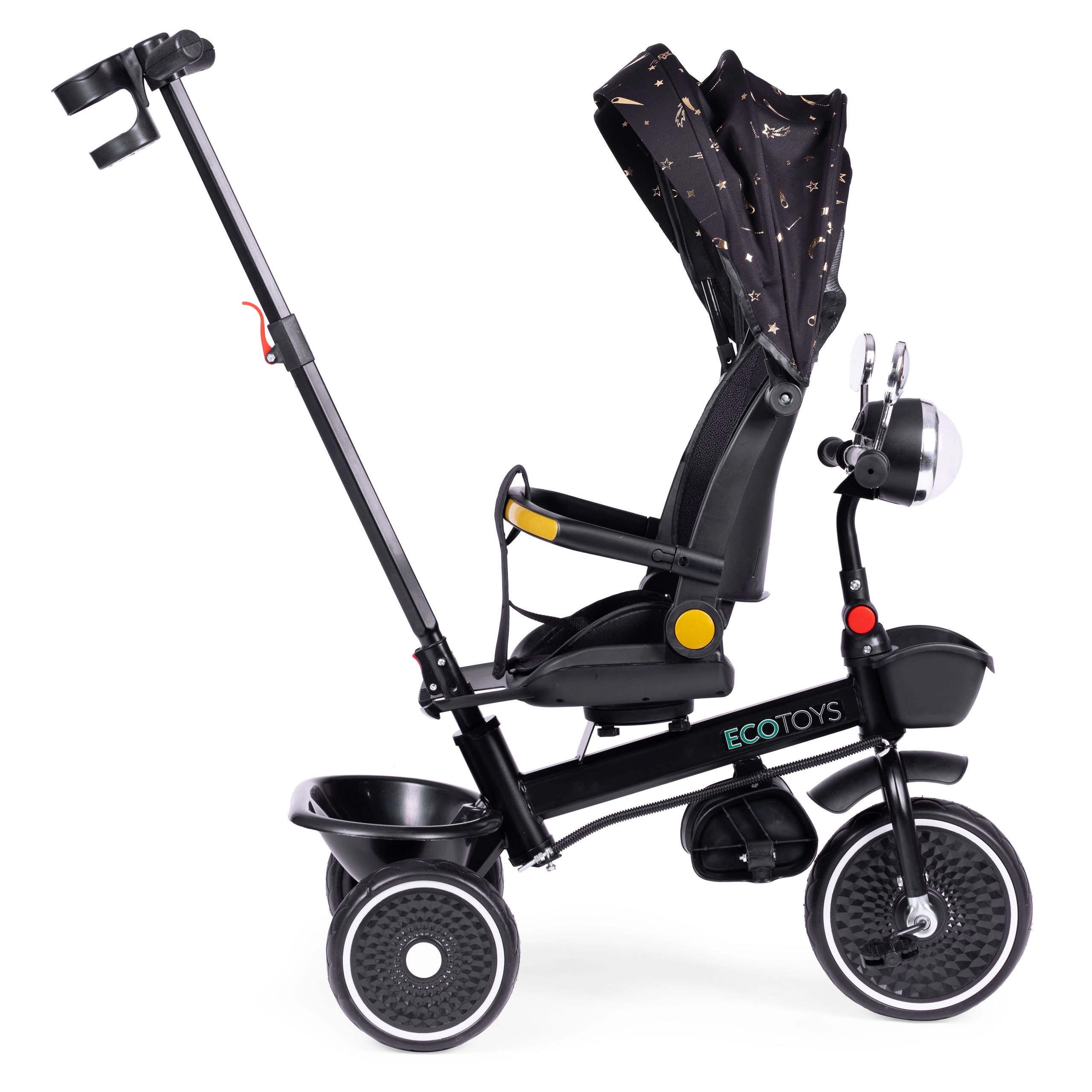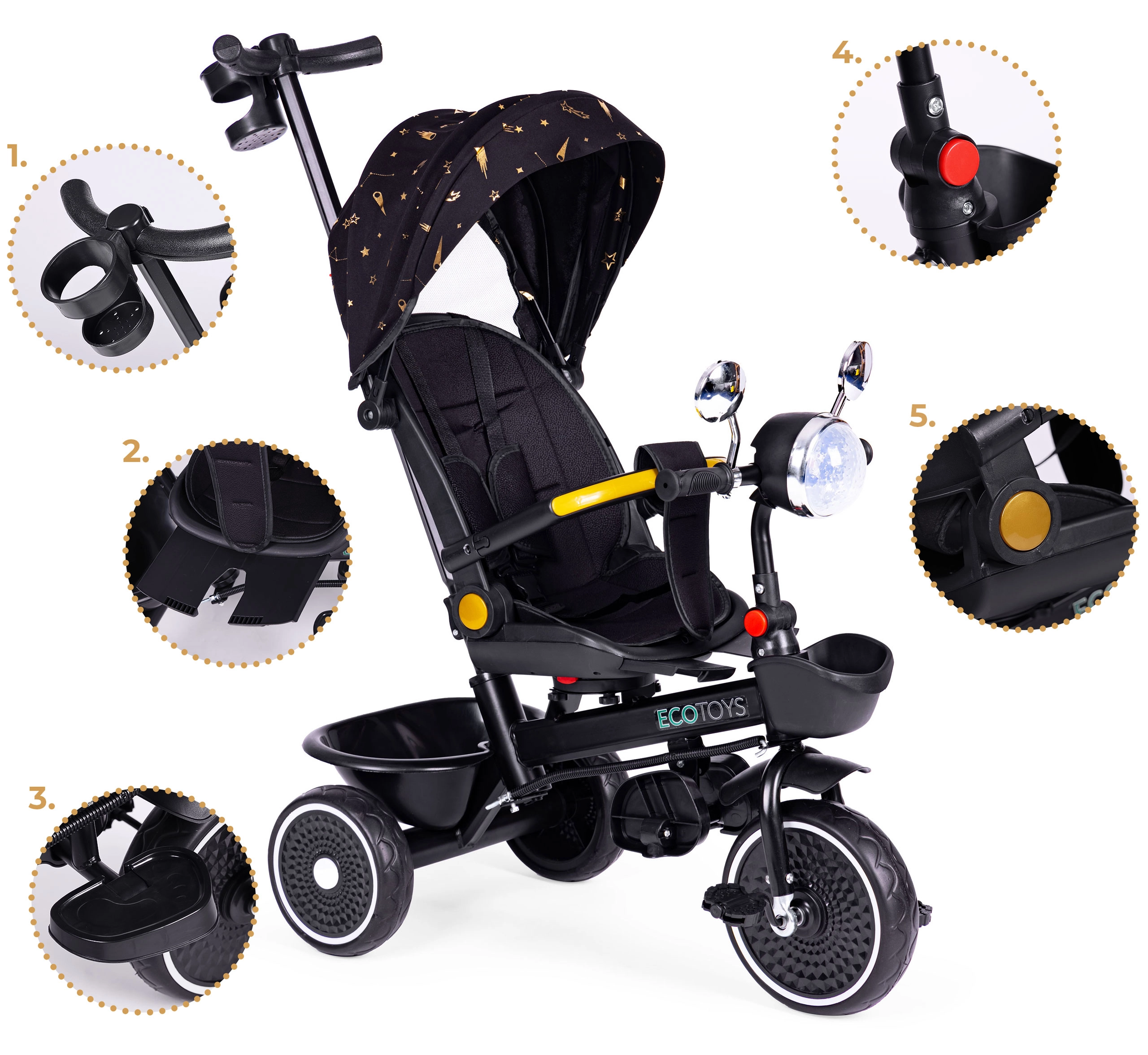 Le tricycle multifonction ECOTOYS grandit avec votre enfant de 6 mois à 6 ans. Il offre un siège pivotant à 360°, une barre de guidage pour les parents, un auvent pliant et des ceintures de sécurité ainsi que des arceaux. Grâce à sa structure en acier robuste, ses roues en EVA et à des accessoires pratiques (lumière avec mélodies, porte-gobelet, paniers de rangement), il garantit confort, sécurité et plaisir à chaque sortie.