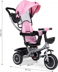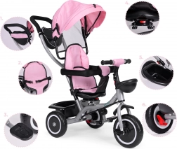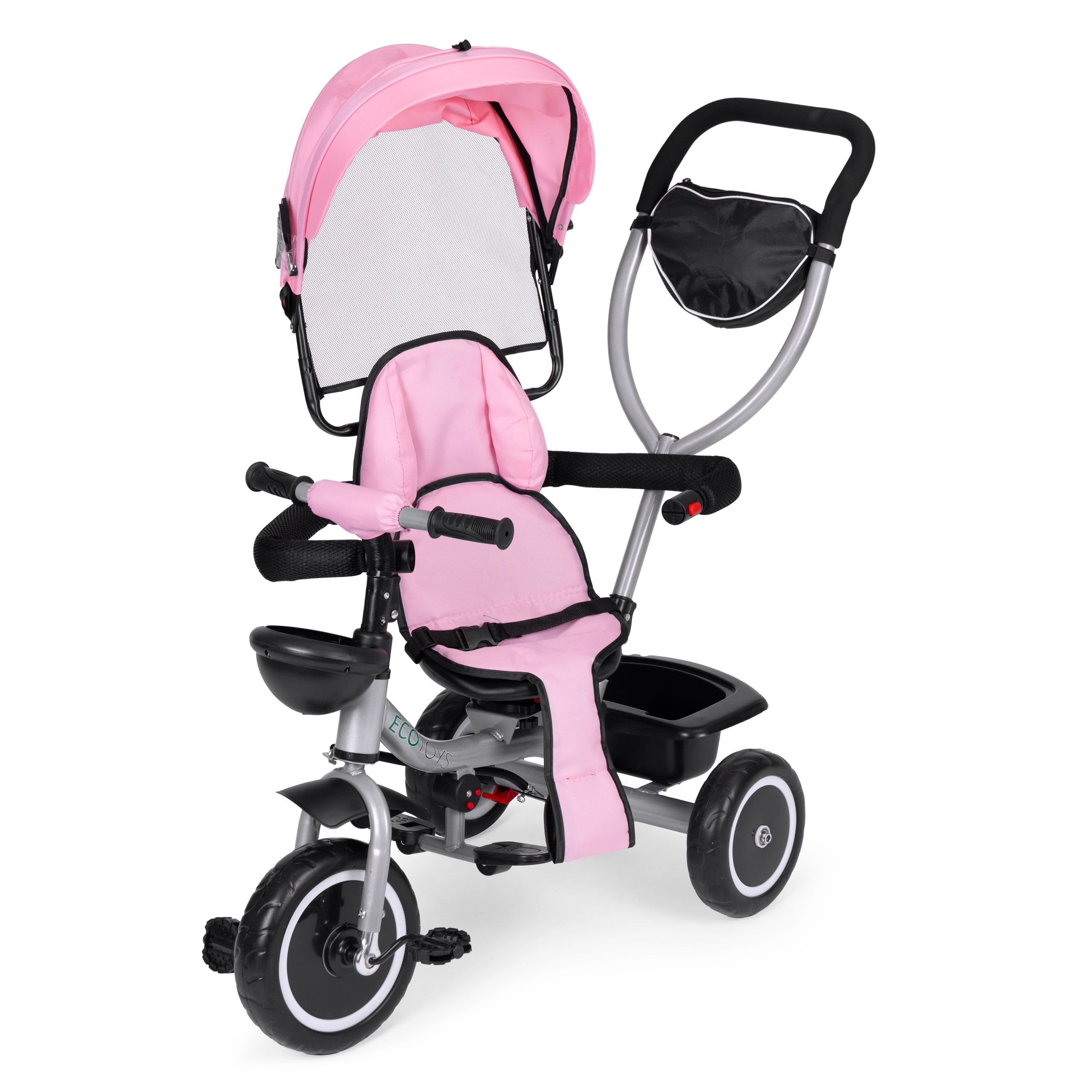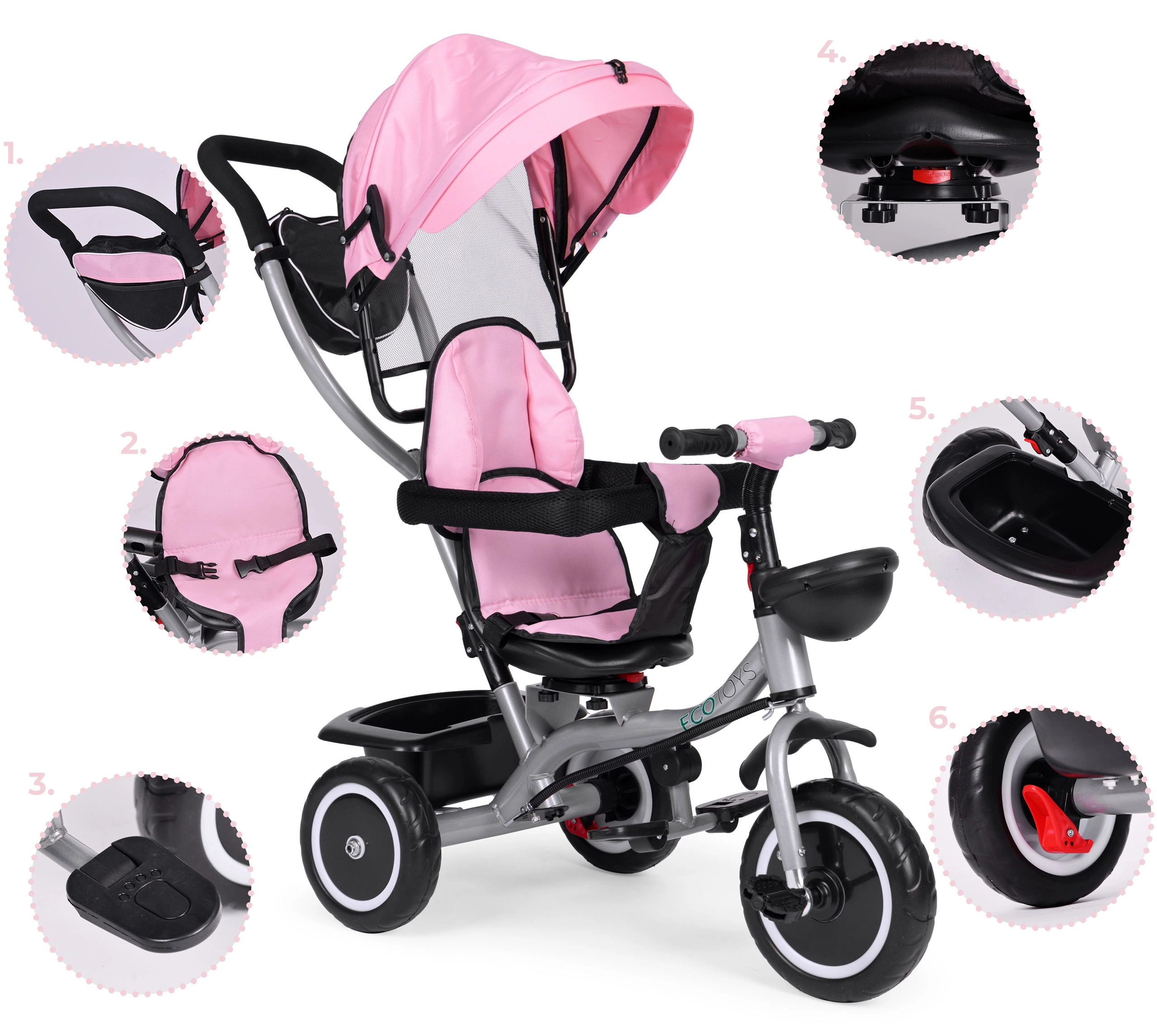 Selon l’âge, vous pouvez retirer facilement des éléments (auvent, barre, poignée de guidage) et adapter le tricycle aux compétences de l’enfant. Les paniers pratiques et la poche zippée accueillent jouets, gourde et petits objets pour la route.