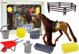 Cheval avec selle et bride, enclos, brouette, foin, râteau, fourche, seau, brosse, 3× récipient pour nourriture et eau