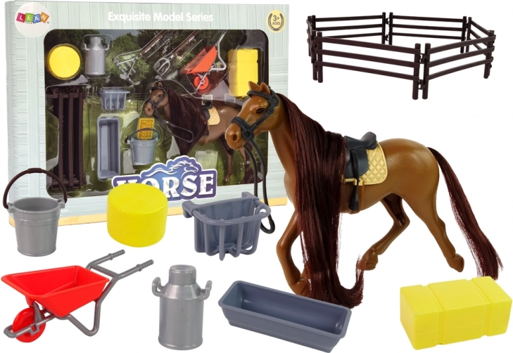 Brouette, seau, brosse, foin, râteau, fourche, récipients pour la nourriture et l’eau, ainsi que l’enclos – tout pour un jeu d’écurie réaliste.