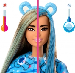 Une fois le mignon costume d’ours bleu retiré, on découvre une poupée Barbie stylée avec des articulations mobiles. La partie supérieure du costume se retourne et se transforme en veste mode toute douce, la tête d’ours devient un petit nid pour le mini ourson. La boîte comprend des accessoires d’habillage et de coiffure pour des heures de jeu.