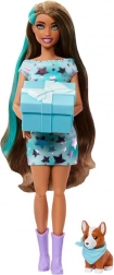 Découvre qui se cache à l’intérieur ! Cette version comprend une BARBIE brune avec des mèches turquoise, une robe scintillante à étoiles violettes et des chaussures violettes assorties. Le set inclut aussi un adorable corgi avec bandana – l’invité d’honneur de toute fête d’anniversaire.