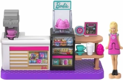 La mini pâtisserie offre de nombreux éléments réalistes pour des heures de jeu. Inclus : station de préparation du café avec gobelet coulissant, vitrine tournante avec “pâtisseries” et table intégrée avec assise pour les clients. La mini poupée BARBIE se plie à la taille, s’assoit confortablement à la table ou derrière le comptoir et se fixe sur un socle en forme de cœur compatible avec les autres sets de la série MINI BARBIE LAND.