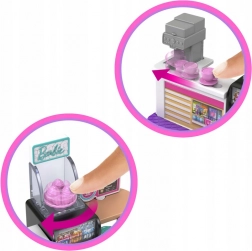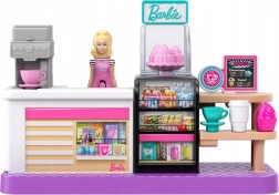 Mini poupée Barbie (env. 3,5 cm), station café avec gobelet coulissant, vitrine tournante avec pâtisseries, petite table et siège, socle en forme de cœur