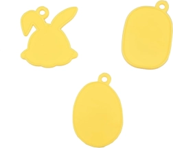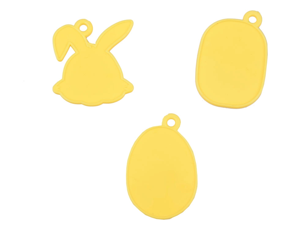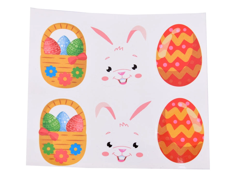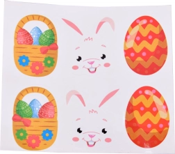 - 3 pendentifs double face à décorer avec des autocollants – une tête de lapin, un panier et un œuf décoré.