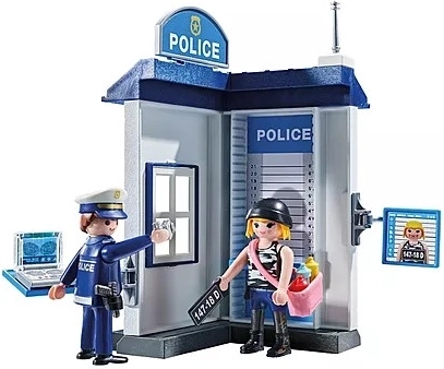 - 2 figurines (policier et civil), poste POLICE, table, tableau, ordinateur portable, caméra, cônes de signalisation et autres accessoires