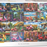Le puzzle EUROGRAPHICS 16 scooters propose un défi de taille : 1000 pièces avec une forme inhabituelle et une grille de découpe non standard, ce qui augmente la difficulté d’assemblage. Une fois assemblé, le puzzle mesure env. 68 × 48 cm.
